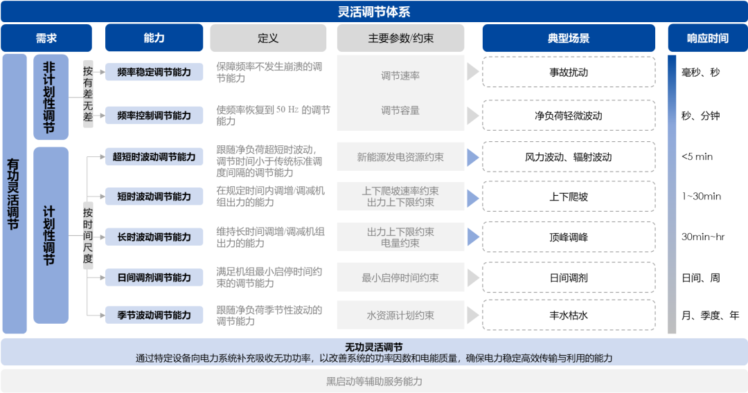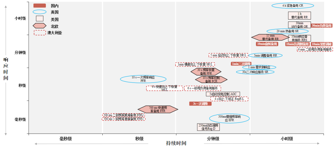 從國(guó)際經(jīng)驗(yàn)看,歐美等國(guó)家的靈活調(diào)節(jié)體系更強(qiáng)調(diào)非計(jì)劃性調(diào)節(jié),在頻率控制調(diào)節(jié)能力、頻率恢復(fù)調(diào)節(jié)能力上,有更細(xì)致的分級(jí)與更開(kāi)放的市場(chǎng)。同時(shí),近年來(lái)持續(xù)細(xì)化顆粒度,新增了毫秒級(jí)響應(yīng)時(shí)間服務(wù)(美國(guó)的RegD、英國(guó)的EFR、北歐的FFR、澳大利亞的FFR1)。當(dāng)前,國(guó)內(nèi)進(jìn)入輔助服務(wù)市場(chǎng)交易的產(chǎn)品以調(diào)峰輔助服務(wù)居多,國(guó)外成熟電力市場(chǎng)體系中均未設(shè)置調(diào)峰輔助服務(wù),相關(guān)能力的價(jià)值通過(guò)在現(xiàn)貨主能量市場(chǎng)中解決;國(guó)內(nèi)外在超短時(shí)波動(dòng)調(diào)節(jié)能力上,都存在較大空缺。隨著接入電網(wǎng)的可再生能源及電力電子裝備的比例日益增大,在超短時(shí)的時(shí)間尺度上的靈活調(diào)節(jié)充裕度或?qū)⑹艿教魬?zhàn)。各國(guó)靈活調(diào)節(jié)能力產(chǎn)品的性能要求如下圖所示。