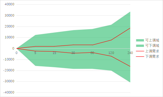 分析與評(píng)估靈活調(diào)節(jié)能力裕度時(shí),可統(tǒng)計(jì)其指定時(shí)間范圍內(nèi)各響應(yīng)時(shí)間尺度的最大需求與最小調(diào)節(jié)能力,將上調(diào)與下調(diào)拼接到一張圖上,形成“可調(diào)域”。其次,納入最大調(diào)節(jié)需求曲線,若需求曲線全在可調(diào)域內(nèi),則表示靈活調(diào)節(jié)裕度充足;若需求曲線超出了可調(diào)域,則超出部分對(duì)應(yīng)的響應(yīng)時(shí)間尺度存在缺額。