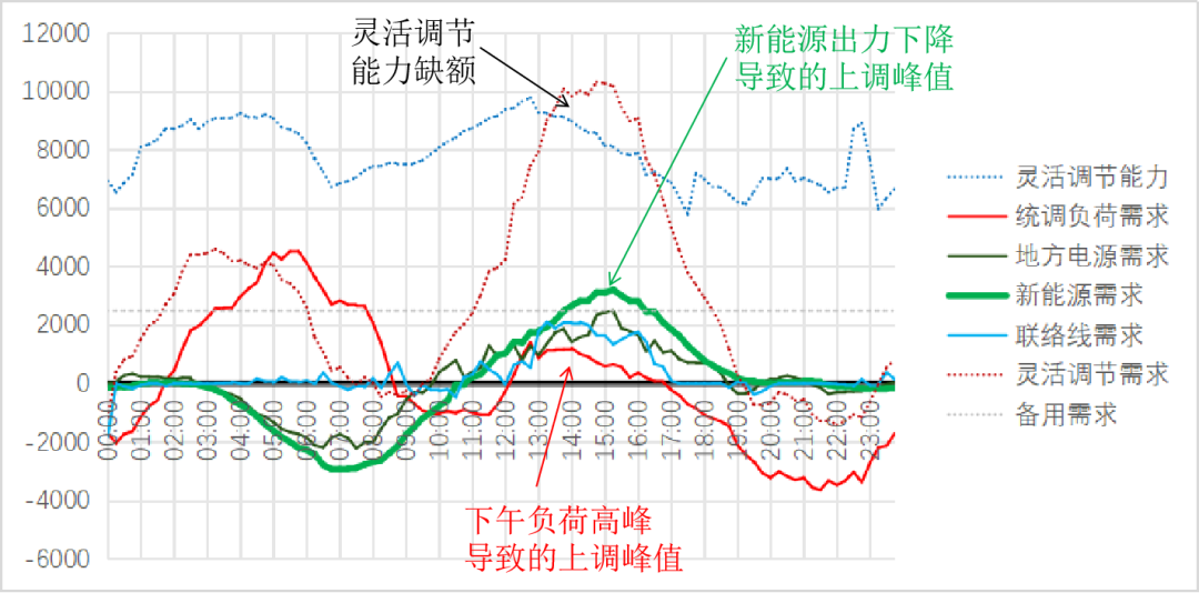 隨著新能源滲透率大幅提高,新能源出力的急劇上升會(huì)導(dǎo)致系統(tǒng)急需減小出力,產(chǎn)生下調(diào)需求峰值;而新能源出力的急劇下降則會(huì)導(dǎo)致系統(tǒng)急需加大出力,產(chǎn)生上調(diào)需求峰值。因此,對(duì)于光伏裝機(jī)容量較大的區(qū)域,新能源波動(dòng)產(chǎn)生的調(diào)節(jié)需求峰值易與系統(tǒng)負(fù)荷曲線產(chǎn)生的調(diào)節(jié)峰值形成“峰上疊峰”。