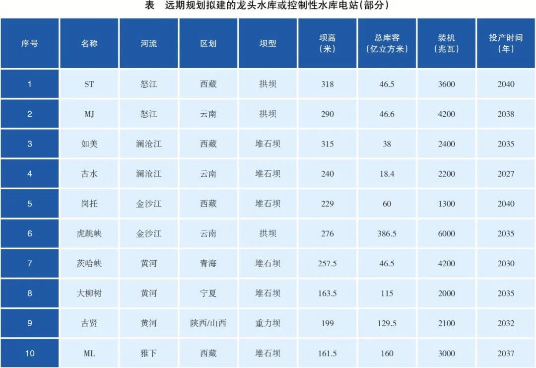 一是積極推動(dòng)雅魯藏布江下游水電開(kāi)發(fā),推動(dòng)西藏清潔能源基地開(kāi)發(fā)論證;二是加快河流龍頭水庫(kù)或控制性水庫(kù)建設(shè)(見(jiàn)表),增強(qiáng)梯級(jí)綜合利用效益;三是推動(dòng)水電基地升級(jí)為更大規(guī)模的水風(fēng)光儲(chǔ)一體化清潔能源基地,加快流域水風(fēng)光儲(chǔ)互補(bǔ)開(kāi)發(fā)規(guī)劃論證,推動(dòng)水電機(jī)組改造和擴(kuò)機(jī);四是在加快建設(shè)抽水蓄能電站的同時(shí),推動(dòng)梯級(jí)水電儲(chǔ)能工廠建設(shè),因地制宜配置新型儲(chǔ)能。