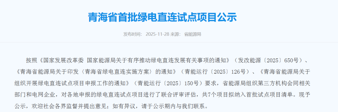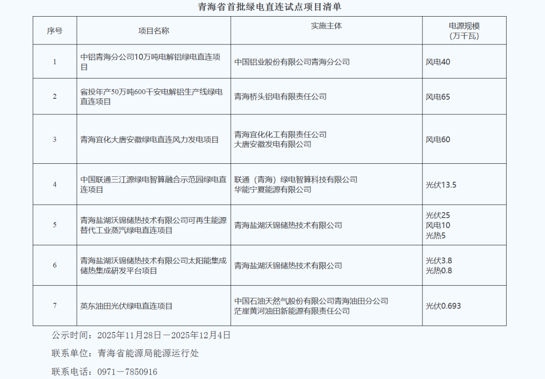 中國(guó)儲(chǔ)能網(wǎng)訊:11月28日,青海省發(fā)改委發(fā)布首批綠電直連試點(diǎn)項(xiàng)目公示。經(jīng)評(píng)審評(píng)估,共7個(gè)項(xiàng)目擬納入首批試點(diǎn)項(xiàng)目清單。項(xiàng)目類型包括電解鋁、智算融合、油田項(xiàng)目等,涉及裝機(jī)規(guī)模2237.93MW。其中,光伏裝機(jī)規(guī)模429.93MW,風(fēng)電裝機(jī)規(guī)模1750MW,光熱58MW。