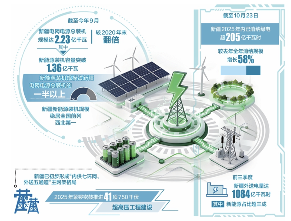 綠電不僅要發(fā)得出,還要送得走、用得好。新疆以“內(nèi)供七環(huán)網(wǎng)、外送五通道”主網(wǎng)架為骨架,織就一張覆蓋全域、聯(lián)通全國(guó)的綠色能源動(dòng)脈網(wǎng)。