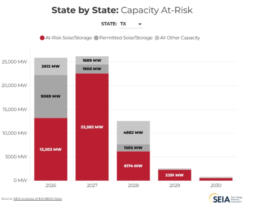 中國儲能網(wǎng)訊:日前,美國太陽能產(chǎn)業(yè)協(xié)會(SEIA)發(fā)出警告,新的聯(lián)邦許可、稅收和補(bǔ)貼政策,致使德克薩斯州計劃開發(fā)的13GW以上太陽能發(fā)電場和電池儲能系統(tǒng)面臨無法在2026年并網(wǎng)風(fēng)險,并且2027年受到影響的項目規(guī)模將會更大。