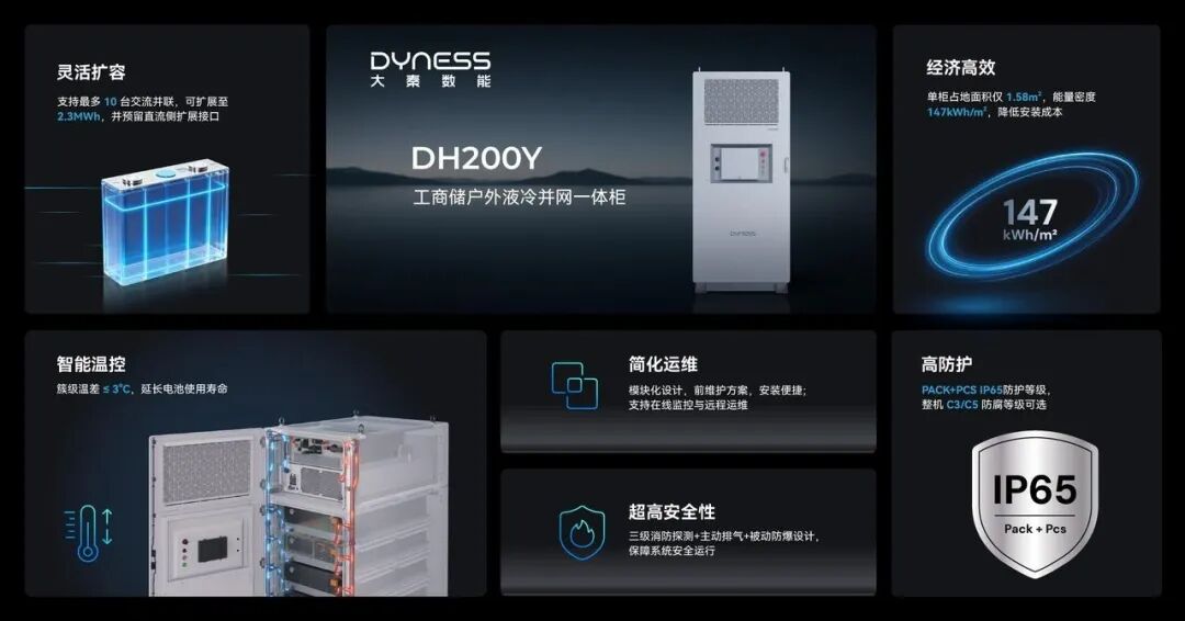 本項目所采用的大秦數能DH200Y液冷一體機,其單柜容量高達232kWh,支持最多 10 機交流并聯,可擴展至 2.3MWh,能夠適配不同規(guī)模的用電需求。該產品具有設計緊湊、占地面積小的特點,能量密度達147kWh/㎡,能夠為客戶有效節(jié)約用地空間。在安全層面,DH200Y 搭載了 Pack 級電芯監(jiān)測、三級消防探測以及主動排氣和被動防爆設計,通過全方位防護設計確保設備長期安全穩(wěn)定運行。該產品廣泛適用于辦公園區(qū)、商業(yè)樓、充電站等多種并網場景,是企業(yè)構建高效、可靠智慧能源體系的理想選擇。