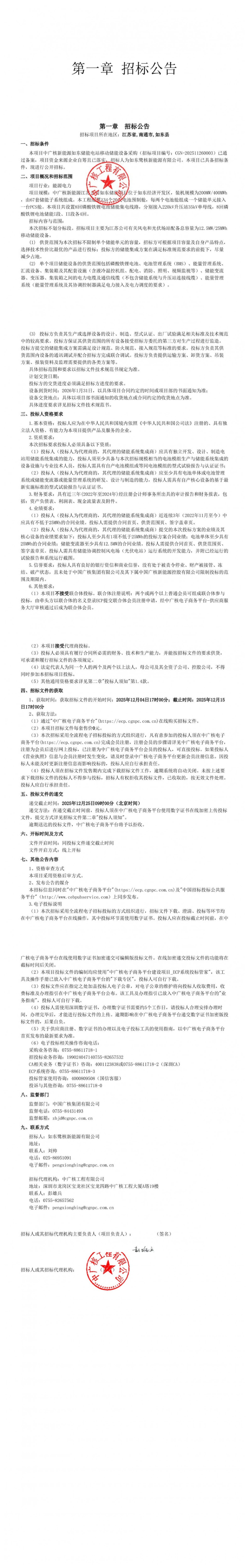 中國儲能網(wǎng)訊:12月5日,中廣核新能源如東儲能電站移動儲能設(shè)備采購招標公告發(fā)布。