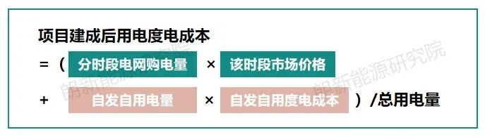 而項(xiàng)目建成后的用電度電成本,需綜合考量不同時(shí)段自電網(wǎng)購入的電量及其對應(yīng)市場價(jià)格,以及自發(fā)自用電量對應(yīng)的內(nèi)部發(fā)電成本,按用電比例加權(quán)平均得出。公式如下: