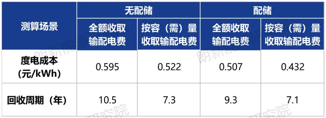 經(jīng)測算,發(fā)現(xiàn)采用單一制容(需)量輸配電費(fèi)模式后,光伏模式具備較好經(jīng)濟(jì)性,配儲后經(jīng)濟(jì)性更佳。項(xiàng)目對應(yīng)兩種輸配電費(fèi)收取方式分別測算度電成本為0.595元、0.522元,回收周期為10.5年、7.3年。若配備儲能,能夠有效提升發(fā)用曲線適配度,減少電網(wǎng)購電支出,度電成本降至0.507元、0.432元,回收周期縮短至9.3年、7.1年(表1)。