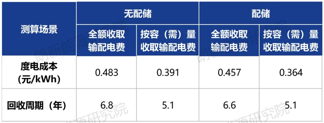 1192號文提到了用戶可自主選擇兩部制或單一容(需)量收費(fèi)機(jī)制,因此本次測算對比了兩種收取輸配電費(fèi)的方式對項(xiàng)目經(jīng)濟(jì)性的影響;此外,650號文中提到“并網(wǎng)型綠電直連項(xiàng)目應(yīng)通過合理配置儲能、挖掘負(fù)荷靈活調(diào)節(jié)潛力等方式,充分提升項(xiàng)目靈活性調(diào)節(jié)能力,盡可能減小系統(tǒng)調(diào)節(jié)壓力。”因此,本次測算對于配儲前后項(xiàng)目的經(jīng)濟(jì)性測算也進(jìn)行了對比。