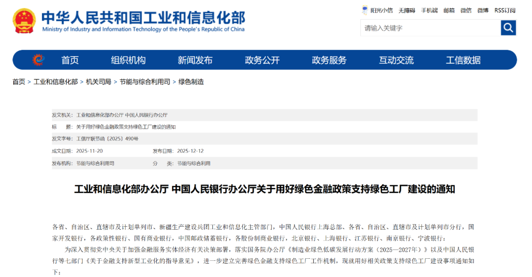 中國儲能網(wǎng)訊:12月12日,工業(yè)和信息化部辦公廳、中國人民銀行辦公廳發(fā)布《關(guān)于用好綠色金融政策支持綠色工廠建設(shè)的通知》。