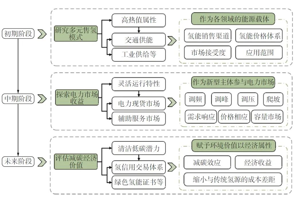 依據(jù)氫能經(jīng)濟(jì)的發(fā)展周期,電-氫互補(bǔ)協(xié)同系統(tǒng)的盈利模式可劃分為3個(gè)階段,如下圖所示。