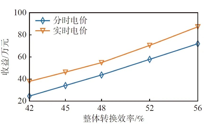 在電價(jià)差固定的邊界條件下,分析電-氫-電整體轉(zhuǎn)換效率對(duì)氫能電站經(jīng)濟(jì)性的影響,結(jié)果如下圖所示。隨著轉(zhuǎn)換效率的提升,無(wú)論是分時(shí)電價(jià)還是實(shí)時(shí)電價(jià)下,氫能電站的經(jīng)濟(jì)性都顯著提升。同時(shí),實(shí)時(shí)電價(jià)下的收益均高于分時(shí)電價(jià),再次驗(yàn)證推進(jìn)電力市場(chǎng)建設(shè)有助于提升氫能電站的收益。