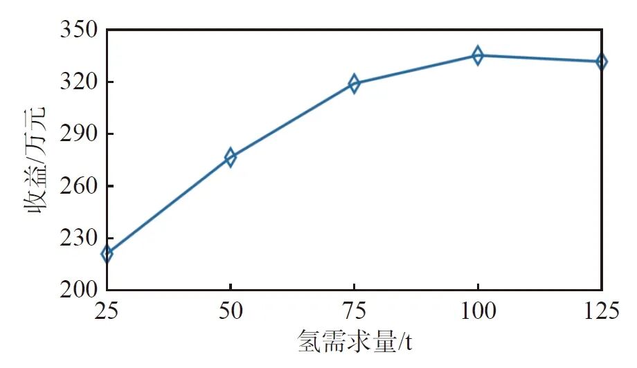在可再生能源裝機(jī)規(guī)模固定的邊界條件下,分析氫需求量對(duì)氫能電站經(jīng)濟(jì)性的影響,結(jié)果如下圖所示。隨著氫需求量的增加,制氫成本可以在更大范圍內(nèi)攤銷,提高了整體經(jīng)濟(jì)效益。然而,當(dāng)氫需求量達(dá)到一定水平后,設(shè)備容量接近飽和,邊際效益開(kāi)始遞減。當(dāng)需求量超過(guò)100噸時(shí),氫能電站不得不在電價(jià)高峰制氫以滿足氫需求,導(dǎo)致收益降低。因此,隨著氫能終端應(yīng)用的多元化,氫能電站的設(shè)備容量需與逐漸攀升的用氫需求相匹配。