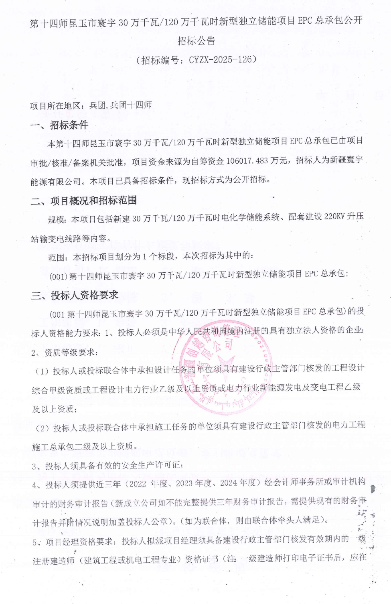 中國儲能網(wǎng)訊:2025年12月15日,新疆寰宇能源有限公司發(fā)布第十四師昆玉市寰宇30萬千瓦/120萬千瓦時(shí)新型獨(dú)立儲能項(xiàng)目EPC總承包招標(biāo)公告,項(xiàng)目資金來源為自籌資金,共計(jì)106017.483萬元,約合單價(jià)0.88元/Wh。