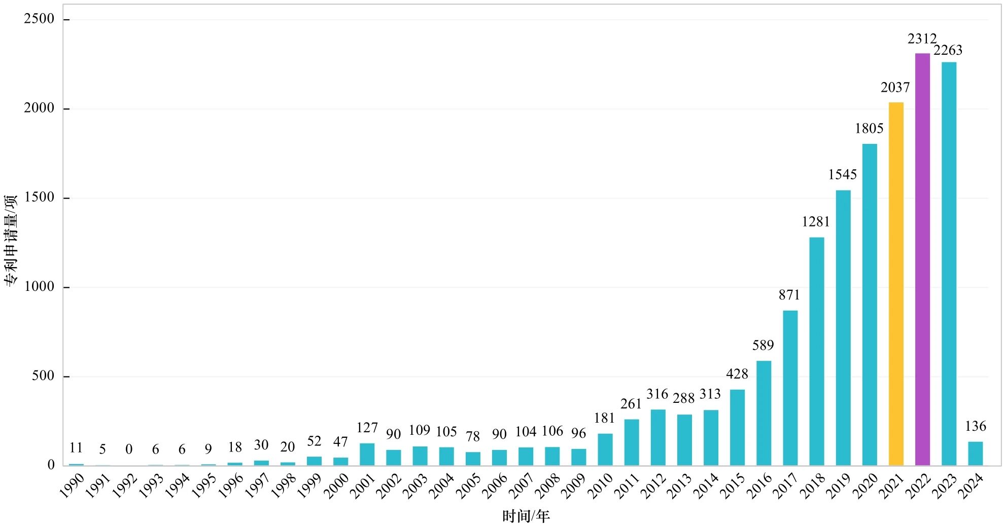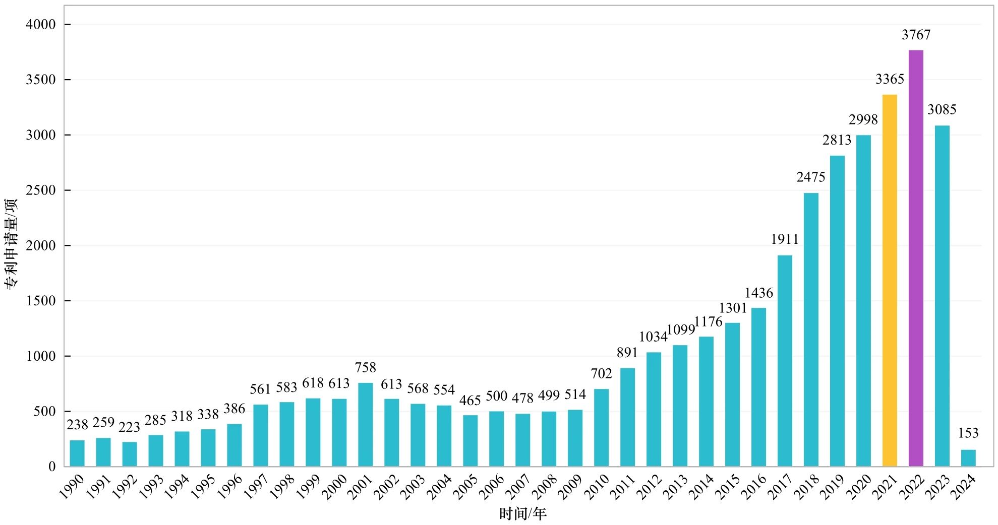 本文在IncoPat商業(yè)數(shù)據(jù)庫中以“固態(tài)電池”為關(guān)鍵詞,運用“專利名稱”“說明書摘要”“權(quán)利要求書”3個字段進行專利檢索,查詢到全球范圍內(nèi)的相關(guān)專利申請數(shù)量共計39 805項。由于1990年之前的固態(tài)電池專利申請數(shù)量相對較少,年申請量在200項以下,故檢索時間范圍設(shè)定為1990年至2024年4月。