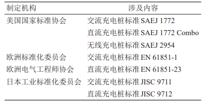 發(fā)達(dá)國家重視新能源汽車充電相關(guān)的安全問題,制定了充電設(shè)施及設(shè)備的安全標(biāo)準(zhǔn)體系,開展安全技術(shù)研發(fā)以提升充電安全能力。從安全標(biāo)準(zhǔn)角度看,發(fā)達(dá)國家針對(duì)充電樁制定的安全標(biāo)準(zhǔn)覆蓋了全產(chǎn)業(yè)鏈,如汽車制造商、電池制造商、汽車零部件制造商、新能源汽車充電站供應(yīng)商、電池開關(guān)站操作員、保險(xiǎn)公司等,主流的充電樁安全標(biāo)準(zhǔn)如表1所示。此外,面向大功率與超快充電的安全管理成為趨勢(shì),如美國、歐洲建立了350 kW功率充電的標(biāo)準(zhǔn)體系,支持解決大功率充電帶來的充電安全、溫升控制、通信協(xié)議等關(guān)鍵問題。