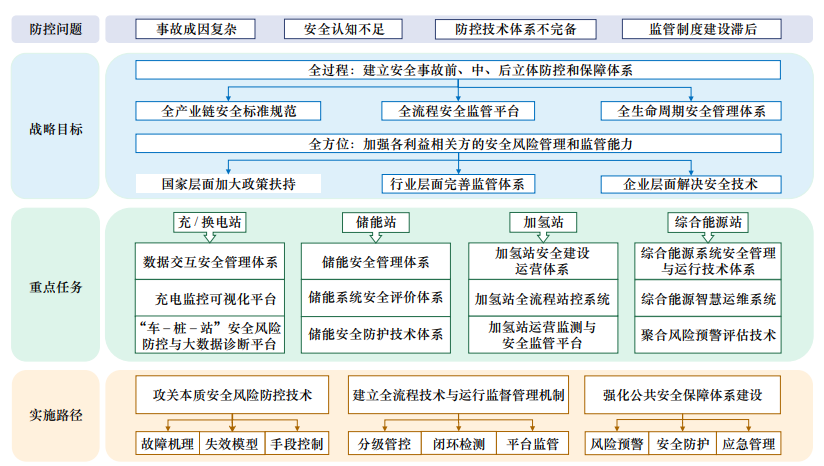 得益于“雙碳”戰(zhàn)略目標(biāo)的驅(qū)動(dòng),新能源應(yīng)用方向戰(zhàn)略發(fā)展的研究熱度進(jìn)一步提高。在產(chǎn)業(yè)發(fā)展方面,汽車產(chǎn)業(yè)強(qiáng)國、新能源汽車發(fā)展路線、燃料電池商用車產(chǎn)業(yè)發(fā)展、氫能基礎(chǔ)設(shè)施產(chǎn)業(yè)發(fā)展等研究均提出加強(qiáng)新能源基礎(chǔ)設(shè)施建設(shè)。在技術(shù)層面,較多關(guān)注充電裝備、儲(chǔ)能設(shè)施、加氫站等產(chǎn)品或裝備的安全規(guī)范標(biāo)準(zhǔn),但相關(guān)安全風(fēng)險(xiǎn)防控技術(shù)的研究有所不足。整體上,已有研究為新能源應(yīng)用發(fā)展提供了發(fā)展思路、前瞻判斷、技術(shù)支撐,但在安全風(fēng)險(xiǎn)防控的目標(biāo)、任務(wù)、路徑上不夠充分和系統(tǒng);特別是相較于新能源發(fā)電設(shè)施,充 / 換電站、儲(chǔ)能站、加氫站、綜合能源站等新興基礎(chǔ)設(shè)施的應(yīng)用安全研究缺失問題尤為突出。