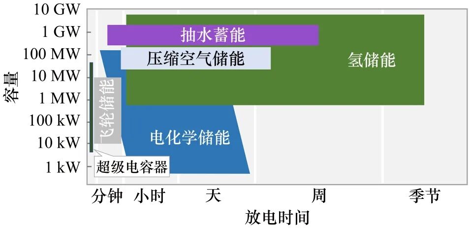 圖1 各類儲(chǔ)能在放電時(shí)間和容量性能的對(duì)比