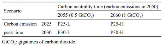 為了探討碳達(dá)峰時(shí)間和碳中和時(shí)間差異對(duì)能源系統(tǒng)轉(zhuǎn)型的影響,設(shè)計(jì)了以下4個(gè)轉(zhuǎn)型情景(表1)。