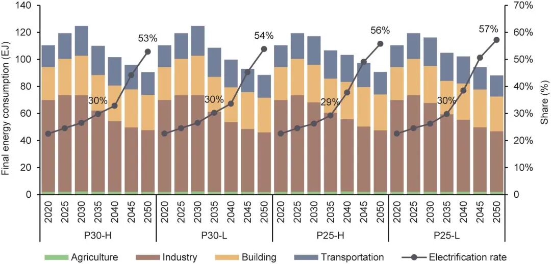 圖5. 分部門(mén)終端能源消費(fèi)及電氣化率。