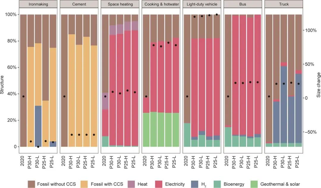 圖6. 2020—2050年能源服務(wù)需求的規(guī)模和技術(shù)占比變化。黑點(diǎn)表示了與2020年相比,能源服務(wù)需求增加(減少)的百分比。
