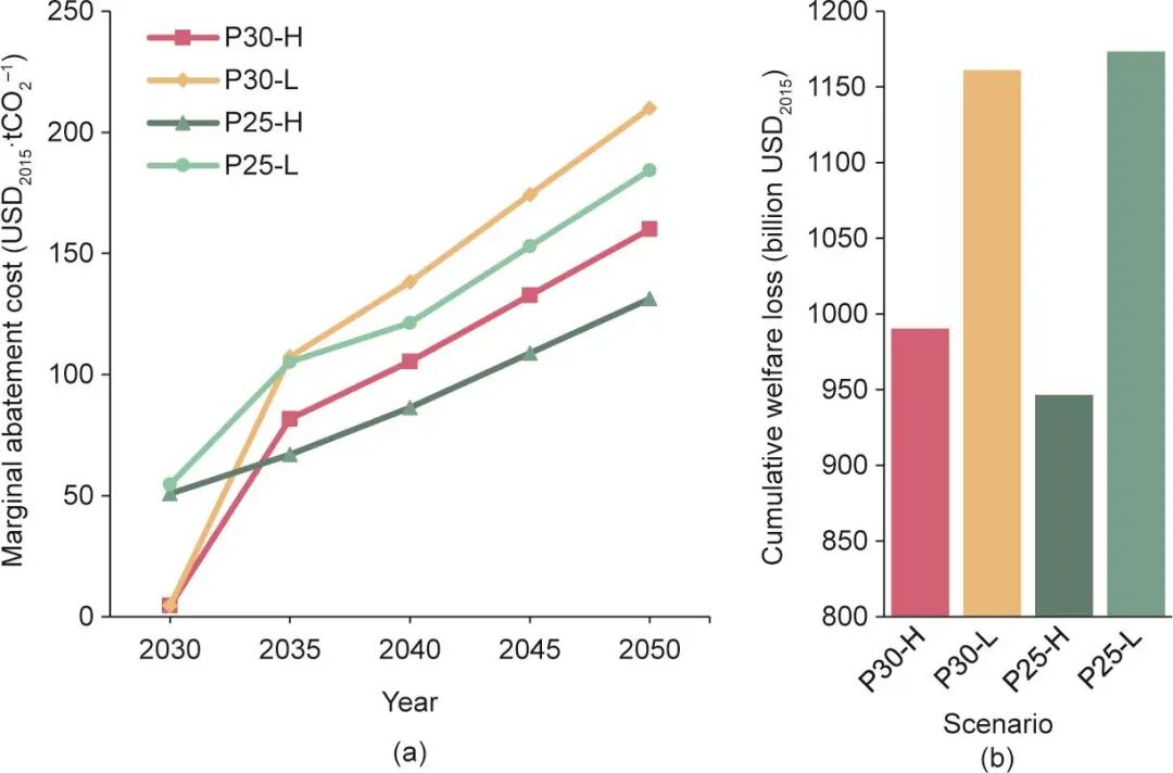 圖8. 邊際減排成本(a)和累計(jì)福利損失(b)。