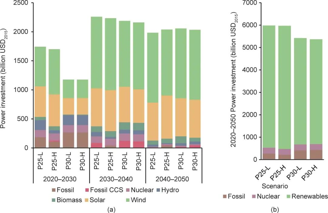 圖9. 電力部門(mén)不同技術(shù)投資(a)和2020—2050年電力部門(mén)總投資(b)。USD2015表示采用2015年美元不變價(jià),并且按照2015年官方公布的匯率將人民幣轉(zhuǎn)換為美元進(jìn)行統(tǒng)計(jì)。