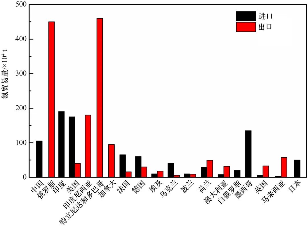 目前,合成氨的生產(chǎn)過程還未實(shí)現(xiàn)綠色?;趥鹘y(tǒng)的合成工藝,全球每年合成氨產(chǎn)量為2×108 t左右,主要產(chǎn)自四個(gè)國家:中國、印度、俄羅斯和美國,并在全球范圍內(nèi)進(jìn)行貿(mào)易。中國和印度雖然合成氨產(chǎn)量巨大,但也是氨的主要進(jìn)口國,而俄羅斯則是主要的出口國,約70%合成氨(約1.7×108 t)用于出口(見圖3)。