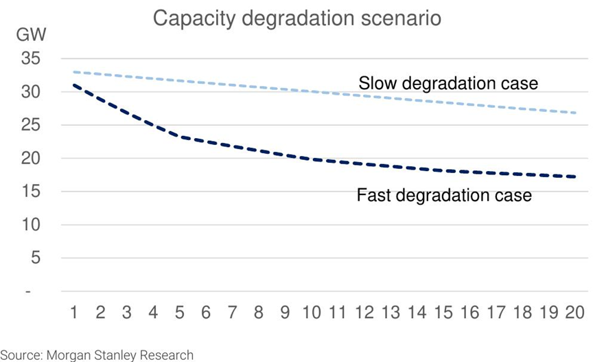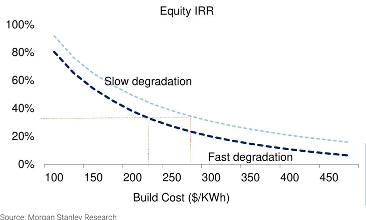摩根士丹利在研報中,用了一個非?!肮こ處熞暯恰钡陌咐和惶變δ芟到y(tǒng),只改一個變量——電池衰減速度。