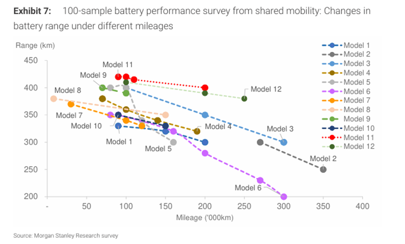 摩根士丹利的研報中,披露了其關于電池性能的調研,報告中展示寧德時代CATL對電池衰減的控制能力最強。