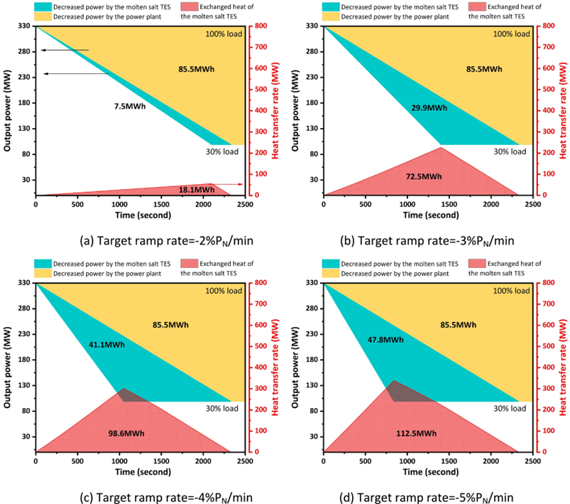 圖3 耦合熔鹽儲熱的燃煤機組在不同爬坡速率下的降負荷過程