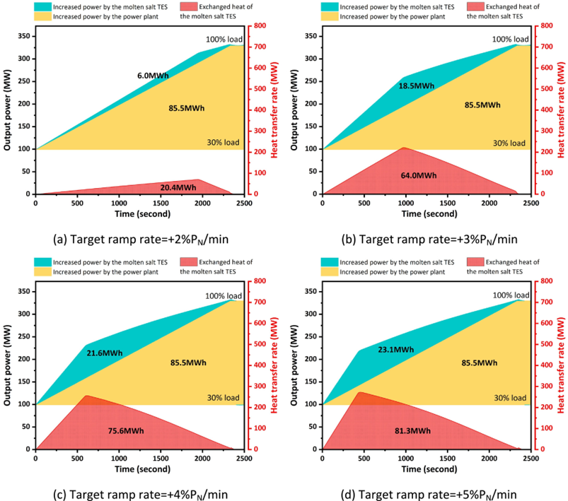 圖4 耦合熔鹽儲熱的燃煤機組在不同爬坡速率下的升負荷過程