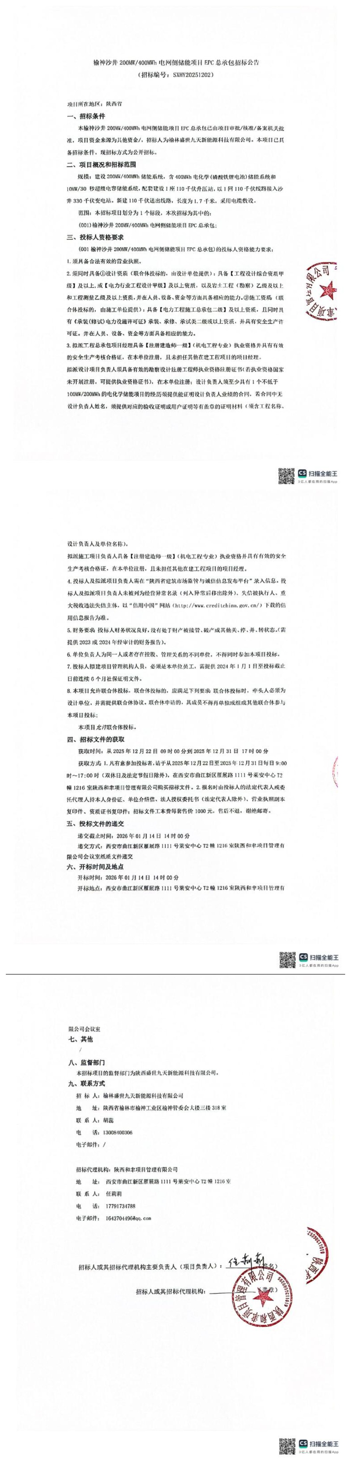 中國儲能網(wǎng)訊:12月22日,榆神沙井200MW/400MWh電網(wǎng)側(cè)儲能項目EPC總承包招標(biāo)公告發(fā)布。