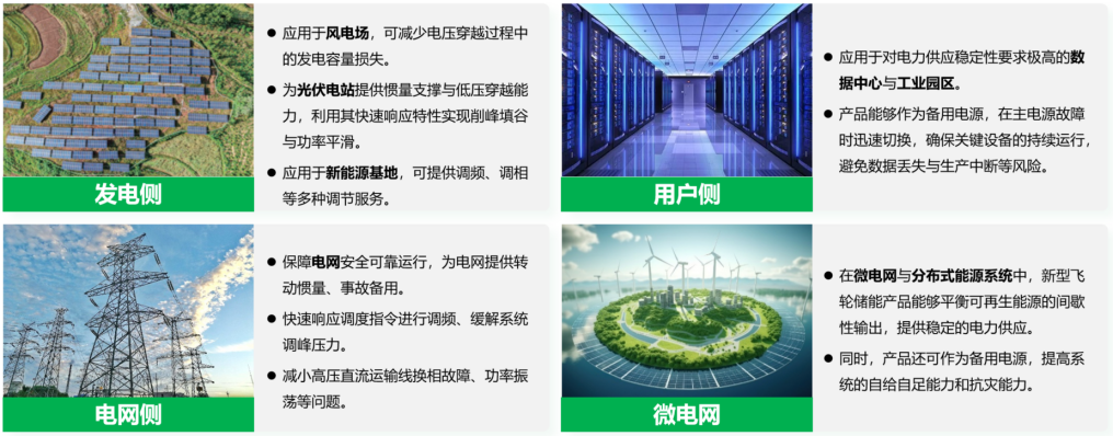 高慣量新型飛輪儲(chǔ)能系統(tǒng)的核心優(yōu)勢在于毫秒級(jí)功率響應(yīng)與物理慣量支撐,未來將在電力系統(tǒng)的發(fā)電側(cè)、電網(wǎng)側(cè)、用戶側(cè)及微電網(wǎng)等場景中發(fā)揮重要作用。