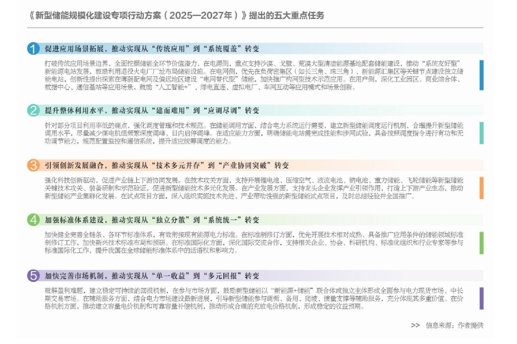 2025年處于“十四五”收官銜接“十五五”謀劃的關(guān)鍵節(jié)點?!缎袆臃桨浮穲猿謫栴}導(dǎo)向和目標(biāo)導(dǎo)向,圍繞新能源消納、電力保供和系統(tǒng)靈活性提升等關(guān)鍵問題,提出2025~2027年階段性發(fā)展目標(biāo):一是2025~2027年全國新增新型儲能裝機容量超過1億千瓦(據(jù)預(yù)測,實際裝機容量或?qū)⒊鲞@個目標(biāo))。二是到2027年底,新型儲能總裝機容量達到1.8億千瓦以上。三是帶動項目直接投資約2500億元。四是新型儲能技術(shù)路線及應(yīng)用場景進一步豐富,培育一批試點應(yīng)用項目,打造一批典型應(yīng)用場景。