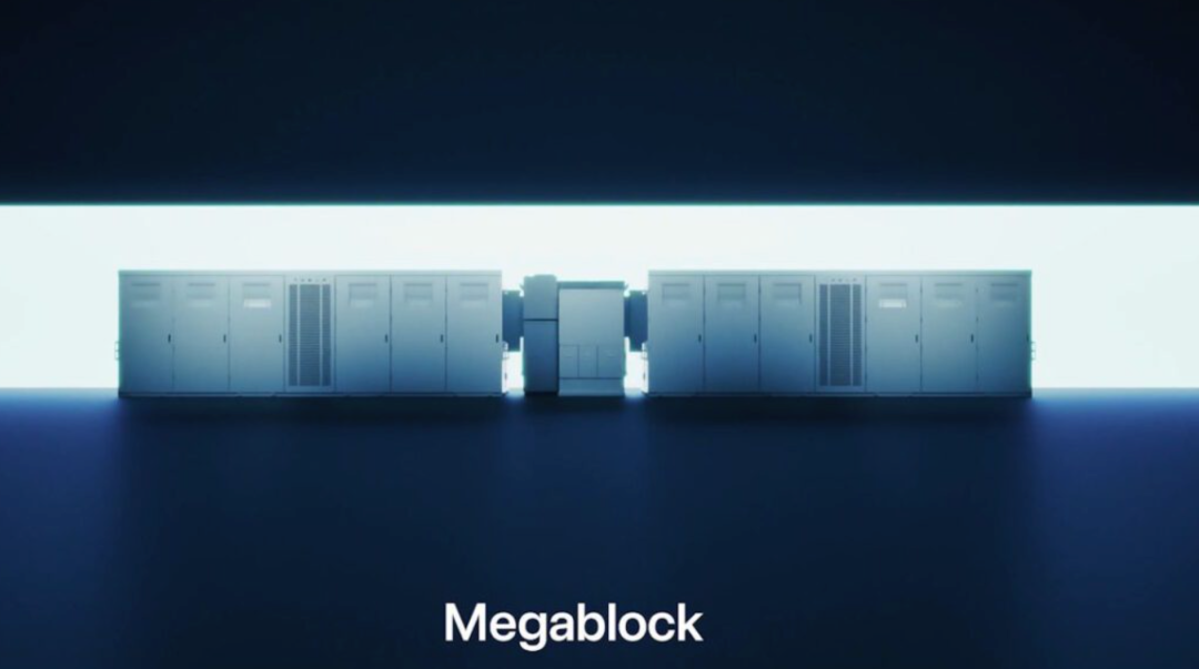 但這次,這個(gè)項(xiàng)目采用的是Tesla在2025年新推出的Megablock技術(shù)的電網(wǎng)級(jí)儲(chǔ)能系統(tǒng),它將4臺(tái)Megapack 3機(jī)組整合成一個(gè)20MWh單元,配備集成變壓器與開關(guān)設(shè)備,實(shí)現(xiàn)標(biāo)準(zhǔn)化、模塊化、可快速部署的工程設(shè)計(jì)。