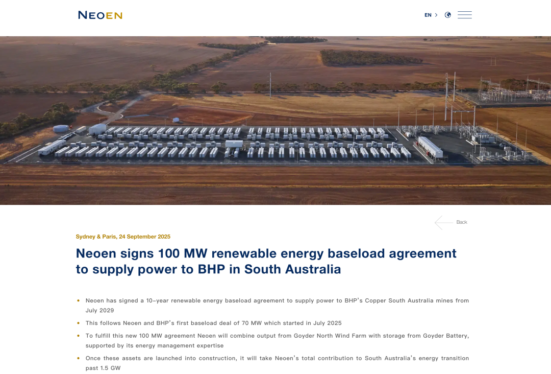 Neoen近期還宣布,與BHP簽署一份為期10年、100 MW的可再生能源基荷供電協(xié)議。根據(jù)協(xié)議,自2029年7月起,Neoen將通過Goyder North風(fēng)電場和Goyder儲(chǔ)能系統(tǒng),為BHP位于南澳的Olympic Dam、Carrapateena和Prominent Hill三大銅礦區(qū)提供全天候(24/7)清潔電力。