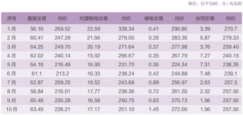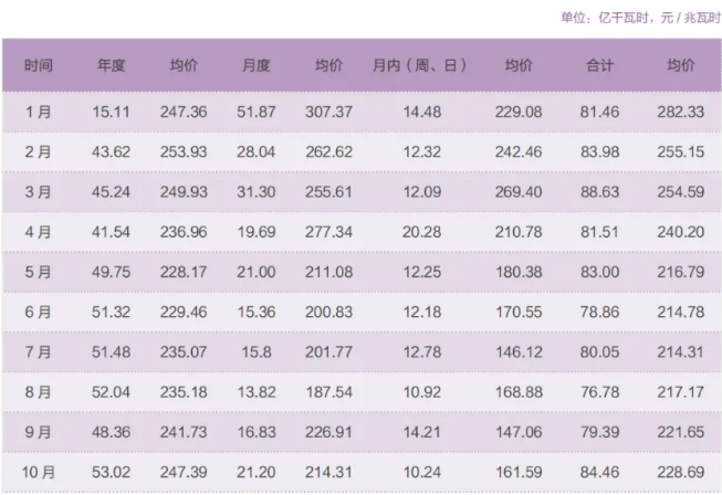 10月,省內(nèi)中長(zhǎng)期市場(chǎng)按自然日連續(xù)運(yùn)營(yíng),交易總成交電量84.46億千瓦時(shí)。其中,年度(多年)交易53.02億千瓦時(shí),成交均價(jià)247.39元/兆瓦時(shí);月度交易成交電量21.2億千瓦時(shí),成交均價(jià)214.31元/兆瓦時(shí);月內(nèi)(周、日)交易成交10.24億千瓦時(shí),均價(jià)161.59元/兆瓦時(shí)。