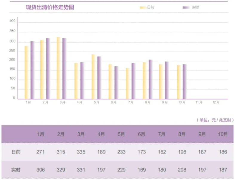 10月,省內(nèi)現(xiàn)貨市場(chǎng)發(fā)電側(cè)正偏差電量59.44億干瓦時(shí),負(fù)偏差電量-55.09億干瓦時(shí),正負(fù)相抵后,凈偏差電量4.35億千瓦時(shí)。日前、實(shí)時(shí)市場(chǎng)最高/最低出清電價(jià)均達(dá)到650元/兆瓦時(shí)和40元/兆瓦時(shí)限價(jià),日前市場(chǎng)平均價(jià)格186元/兆瓦時(shí),同比下降30.9%,環(huán)比下降0.6%,日前市場(chǎng)均價(jià)最高396元/兆瓦時(shí),最低53元/兆瓦時(shí);實(shí)時(shí)市場(chǎng)平均價(jià)格187元/兆瓦時(shí),同比下降33.0%,環(huán)比下降5.1%,實(shí)時(shí)市場(chǎng)均價(jià)最高385元/兆瓦時(shí),最低50元/兆瓦時(shí)。