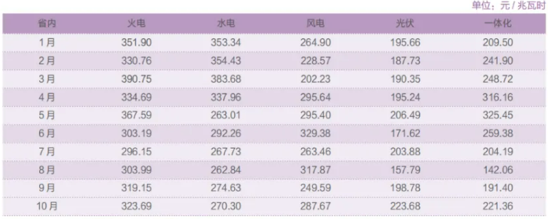 8月,火電結(jié)算均價(jià)323.69元/MWh,水電270.3元/MWh,風(fēng)電287.67元/MWh,光伏223.68元/MWh,一體化221.36元/MWh。