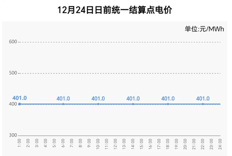 值得注意的是,12月24日安徽電力現(xiàn)貨市場(chǎng)日前統(tǒng)一結(jié)算點(diǎn)電價(jià)為一條直線,從1時(shí)到24時(shí)均為401元/兆瓦時(shí)。具體如下圖: