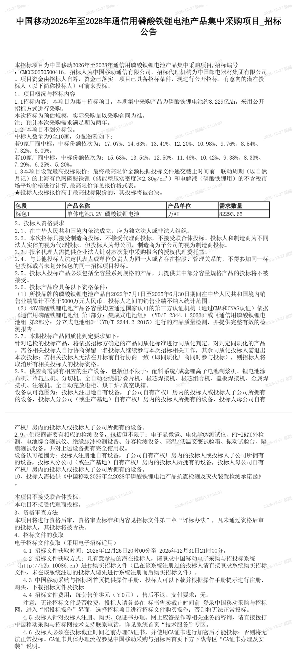 中國(guó)儲(chǔ)能網(wǎng)訊:12月26日中國(guó)移動(dòng)發(fā)布磷酸鐵鋰電池集采公告,共采購(gòu)8.229億Ah的電池,總采購(gòu)量達(dá)2.6338GWh,擬選定9至10家中標(biāo)人。值得注意的是,本次招標(biāo)設(shè)置最高投標(biāo)限價(jià),而且價(jià)格將聯(lián)動(dòng)磷酸鐵鋰(儲(chǔ)能型壓實(shí)密度>2.30g/cm)和電解液(磷酸鐵鋰用)的不含稅市場(chǎng)平均價(jià)格進(jìn)行計(jì)算,高于最高限價(jià)的投標(biāo)人將被否決。