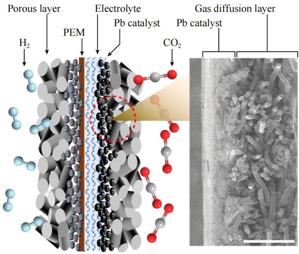 華中科技大學(xué)夏寶玉團(tuán)隊(duì)在Nature中的研究指出一種質(zhì)子交換膜系統(tǒng),并利用廢舊電池回收制備鉛基催化劑,用于酸性CO2電解。其電解槽示意如圖2所示。通過使用堅(jiān)固高效的催化劑、穩(wěn)定的三相界面和耐用的膜,這種卓越的性能將有助于推動(dòng)碳中和技術(shù)的發(fā)展。