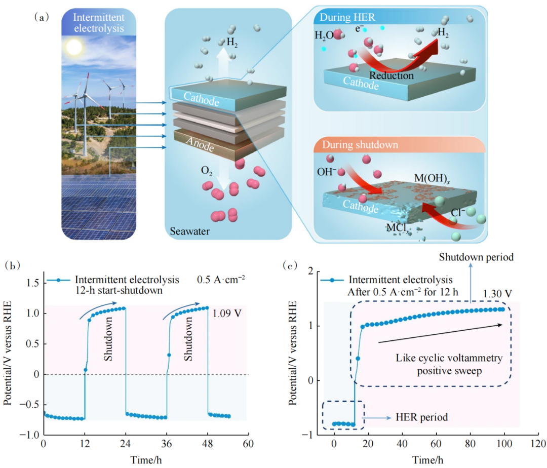 北京化工大學(xué)孫曉明團(tuán)隊(duì)在Nature中的研究指出,波動(dòng)性可再生能源驅(qū)動(dòng)的海水電解中陰極氧化腐蝕問題,如圖3所示。