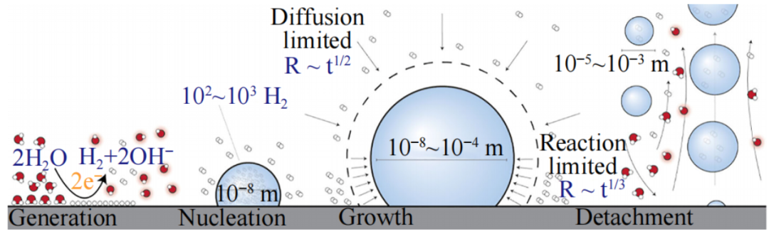 美國俄勒岡大學(xué)化學(xué)與生物化學(xué)系Paul A.Kempler團(tuán)隊(duì)在Chemical Reviews中的研究指出,電解水過程中析氫反應(yīng)和析氧反應(yīng)產(chǎn)生的氣泡會(huì)影響制氫的能量轉(zhuǎn)換效率。其工作也概述了氣泡生命周期中發(fā)生的物理過程,如圖4所示。