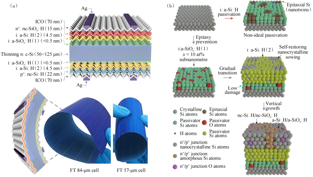 江蘇科技大學(xué)李陽團(tuán)隊(duì)在Nature中的研究指出為避免外延,采用低損傷連續(xù)等離子體化學(xué)氣相沉積策略,成功制造出不同厚度(55~130 μm)的高性能電池。以“超薄、柔性”晶硅異質(zhì)結(jié)太陽能電池的優(yōu)勢(shì),其結(jié)構(gòu)與工藝示意如圖7所示,使得用于旅行的彎曲或卷起晶體硅太陽能電池指日可待。