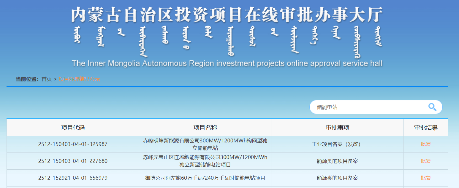 中國(guó)儲(chǔ)能網(wǎng)訊:據(jù)內(nèi)蒙古自治區(qū)投資項(xiàng)目在線審批辦事大廳相關(guān)信息顯示,近日內(nèi)蒙古共有3個(gè)大型儲(chǔ)能項(xiàng)目備案獲批,總投資40.8億元,總儲(chǔ)能規(guī)模達(dá)1.2GW/4.8GWh。