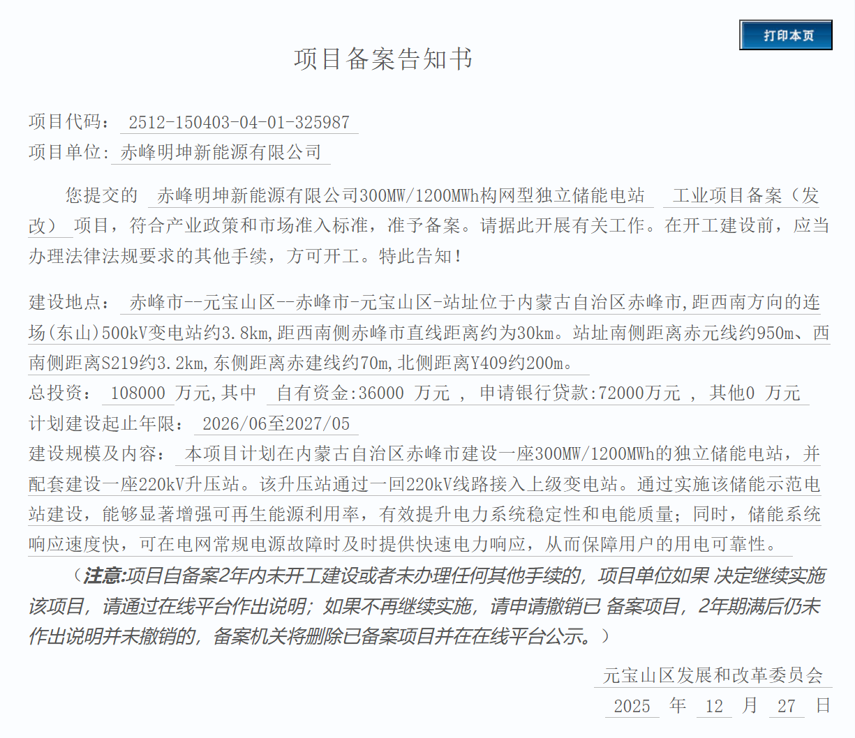計(jì)劃建設(shè)起止年限為2026年6月至2027年5月