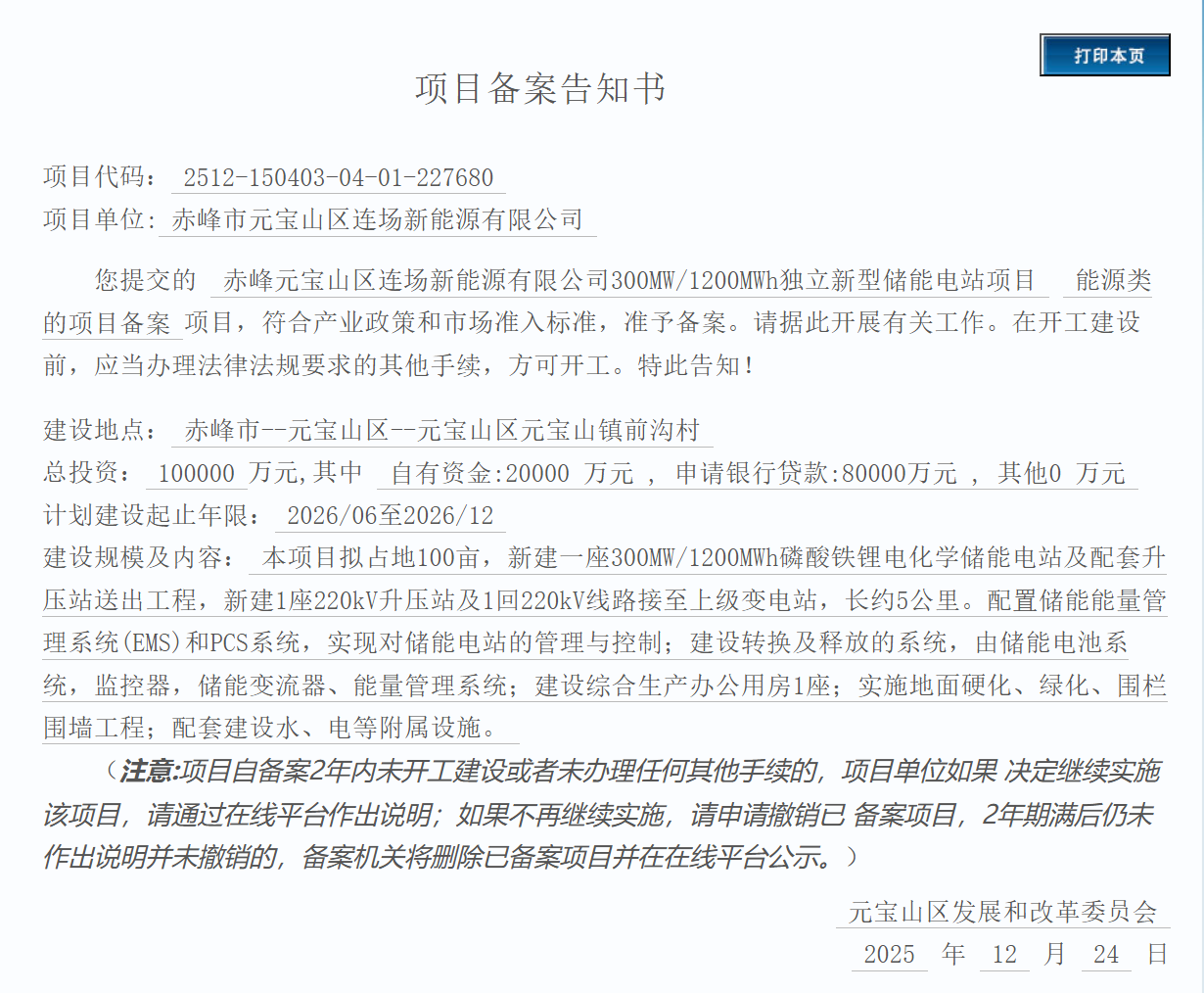 赤峰元寶山區(qū)連場(chǎng)新能源有限公司300MW/1200MWh獨(dú)立新型儲(chǔ)能電站項(xiàng)目