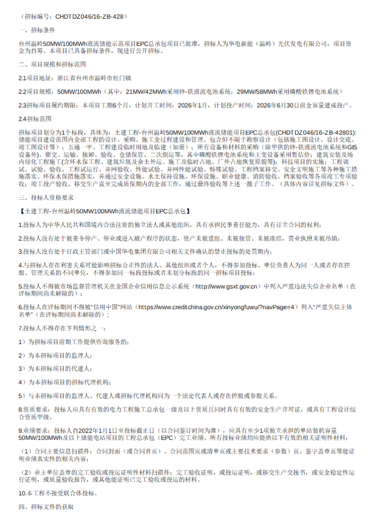 招標(biāo)范圍:招標(biāo)項(xiàng)目劃分為1個(gè)標(biāo)段,具體為:土建工程-臺(tái)州溫嶺5OMW10OMWh液流儲(chǔ)能項(xiàng)目EPC總承包(CHDTDZ046/16-ZB-42801):儲(chǔ)能項(xiàng)目建設(shè)范圍內(nèi)全部工程的設(shè)計(jì)、采購(gòu)、施工全過(guò)程建設(shè)和管理。包含但不限于勘察設(shè)計(jì)(包括施工圖設(shè)計(jì)、設(shè)計(jì)交底、竣工圖設(shè)計(jì)等);五通一平、工程建設(shè)臨時(shí)用地及臨建(如需);所有設(shè)備和材料的采購(gòu)(除甲供的鋅-鐵液流電池系統(tǒng)和G1S設(shè)備外)、催交、運(yùn)輸、接卸、驗(yàn)收、倉(cāng)儲(chǔ)保管、二次倒運(yùn)等,其中磷酸鐵鋰電池系統(tǒng)和主變?cè)O(shè)備采用暫估價(jià);建筑安裝及場(chǎng)內(nèi)綠化工程施工(含環(huán)水保工程、建筑垃圾及余土外運(yùn)、施工及臨時(shí)占地、廠外占地恢復(fù)原貌等):科技項(xiàng)目的實(shí)施;工程調(diào)試、試驗(yàn)、驗(yàn)收、工程試運(yùn)行、并網(wǎng)驗(yàn)收、性能試驗(yàn)、并網(wǎng)性能試驗(yàn)、特殊試驗(yàn)、工程檔案移交、安全文明施工等各種施工措施落實(shí)、環(huán)保水保措施落實(shí),并通過(guò)安全設(shè)施、水土保持設(shè)施、環(huán)保設(shè)施、職業(yè)健康、消防驗(yàn)收、檔案驗(yàn)收等各項(xiàng)竣工專(zhuān)項(xiàng)驗(yàn)收;竣工投產(chǎn)驗(yàn)收、移交生產(chǎn)直至完成質(zhì)保期內(nèi)的全部工作,通過(guò)最終驗(yàn)收等上述一攬子工作。(具體內(nèi)容詳見(jiàn)招標(biāo)文件)。