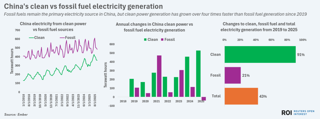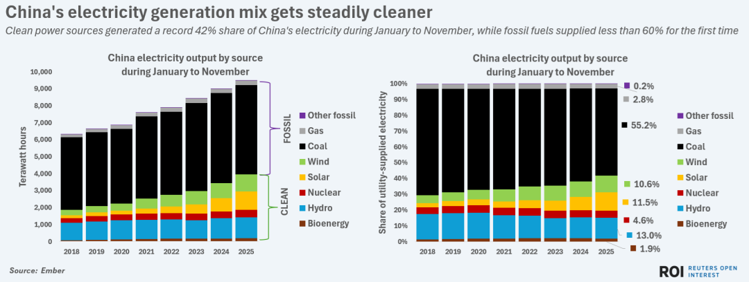 中國繼續(xù)領(lǐng)跑全球清潔能源發(fā)電,其核能、太陽能、風(fēng)能和生物能發(fā)電量均居世界各國之首。根據(jù)Ember數(shù)據(jù),2025年前11個月,全國清潔電力產(chǎn)量同比增長15.4%,有望迎來連續(xù)第七年的強(qiáng)勁增長。在1月至11月期間,清潔電力在中國總發(fā)電量中的占比創(chuàng)下42%的新高,而化石燃料的占比首次降至不足60%。這是歷史上首次,清潔電力將占中國公用事業(yè)發(fā)電量的40%以上,而化石燃料的份額則跌至新低。